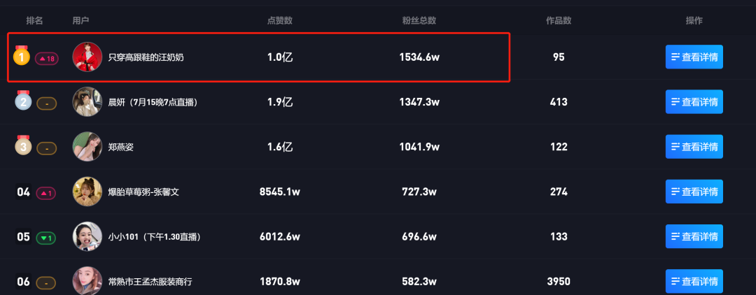 在抖查查的穿搭帐号粉丝榜上,第1位是“只穿高跟鞋的汪奶奶”,拥有1534万粉丝,而排在第600名仍然有42万的粉丝数量。