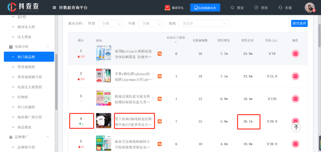 从排行榜来看,一款男装T恤排在第4位,日销量5万,比排第1的防晒霜少了2万,但总销量多了15万。