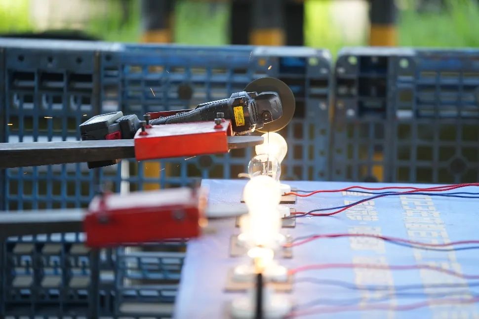 现场实操项目分为电钻钻气球、角磨机切割铁丝、搭积木三个环节,既考验职工的现场应变能力,又综合考察职工对驾驶技巧、叉运定位准确性掌握、实操熟练程度及心理素质等多方面情况。电钻钻气球需要将固定在货叉上的电钻穿过玻璃细管并钻破气球,且不得损坏玻璃管,在细微之处见真章。角磨机切割铁丝则是通过固定在货叉上的角磨机切割捆绑在灯泡上的铁丝,切割时不得损坏工作中的灯泡,在毫厘之间定乾坤。搭积木则在规定时间内将4根积木、8瓶矿泉水运送到指定位置进行叠放,每次只能插取1根积木且保证矿泉水不掉落,依次叠放4根积木且保持平衡即满分,在平衡之中决胜负。