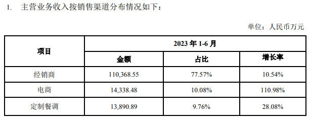 从渠道来看,营收最多的是经销商渠道,营收11.04亿元,同比增长10.54%。不过,营收增长最快的却是电商渠道,营收1.43亿元,同比增长110.98%。据天味食品公告显示,2023上半年公司完成食萃食品并购项目。食萃食品是线上中小 B 渠道复合调味品的头部企业,具有先发优势,具备持续快速增长的能力。本次对食萃食品的并购交易,能够较好补齐公司中小B客户的线上渠道,公司将具备服务包括从单店到大型连锁餐饮在内的所有B端客户的能力,支撑公司主营业务可持续发展,提升综合竞争力,促进产业生态链良性发展。另外,受益于上半年餐饮行业复苏,天味食品定制餐调渠道营收达1.39亿元,同比增长28.08%。