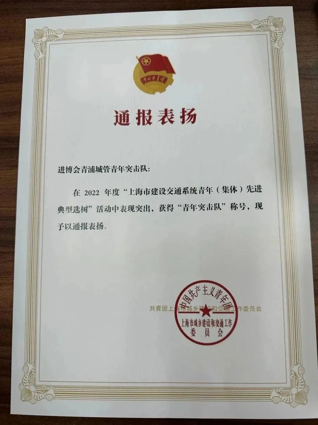 近日,共青团上海市城乡建设和交通工作委员会向公司团委发来贺信,进博会青浦城管青年突击队,在2022年度“上海市建设交通系统青年(集体)先进典型选树”活动中表现突出,获得“青年突击队”称号。