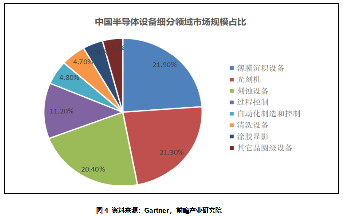 中国半导体设备各细分领域中,薄膜沉积、光刻、刻蚀市场份额占据60%以上市场份额,薄膜沉积占比21.9%;光刻占比21.3%;刻蚀占比20.4%。其次是过程控制占比11.2%,自动化制造和控制占比4.8%,清洗设备占比4.7%,涂胶显影占比3.8%,其他晶圆级设备占比3.8%。