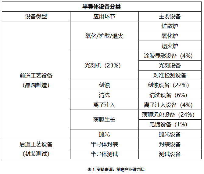 半导体设备按应用环节划分为前道工艺设备(晶圆制造)和后道工艺设备(封装测试)两大类。设备中的前道设备占据了整个市场的80%-85%,其中光刻机,刻蚀机和薄膜设备是价值量最大的三大环节,各自所占的市场规模均达到了前道设备总量的20%以上。