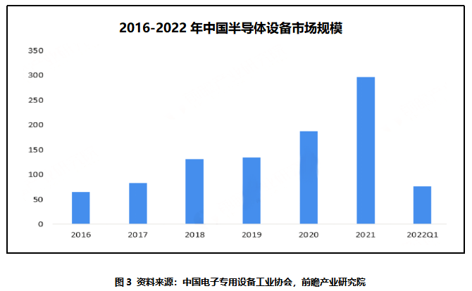 根据中国电子专用设备工业协会数据显示,2020年中国半导体设备市场规模达到187.2亿美元,2021年中国半导体设备市场达到296.2亿美元,相对于2020年来看呈加速增长态势,在2022年一季度达到了75.7亿美元。近五年行业规模复合增速高达35%。