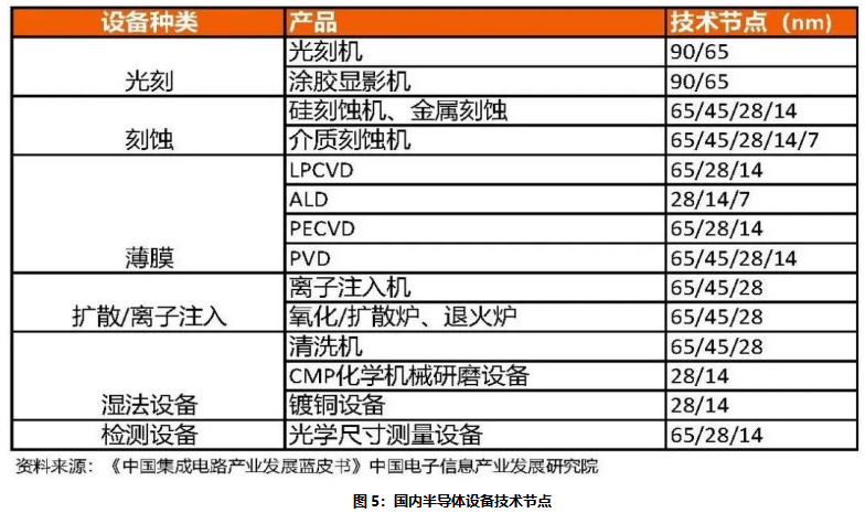工艺技术方面,国产半导体设备厂商在刻蚀、沉积、清洗、涂胶显影等核心工艺环节能与海外传统厂商形成初步的技术对标。从厂商公开数据看,除光刻机工艺之外,大部分国产设备基本覆盖28nm,刻蚀已突破5nm。