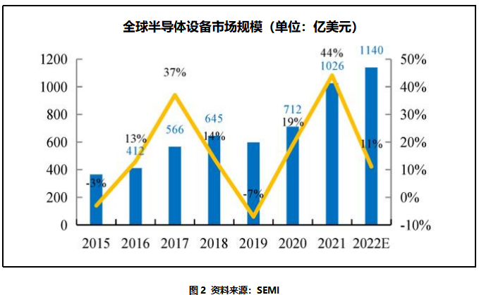 根据SEMI 数据,2021年全球半导体设备市场规模为1026 亿美元,同比增长44%,2022 年市场规模将有11%左右的增速,约达到1140 亿美元,并预计在2023年增至1208亿美元。