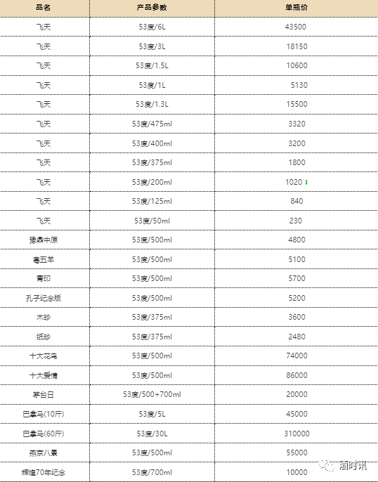 0 珍5 53%VOL 500ML 130 130 0 珍酒尊藏 53%VOL 500ML 255 255 0 老珍酒 53%VOL 500ML 76 76 0 古井贡系列 规格 9.1 9.2 涨幅 古20 52%VOL 500ML 475 475 0 古16 52%VOL 500ML 320 320 0 古8 50%VOL 500ML 220 220 0 古5 50%VOL 500ML 105 105 0 幸福版 50%VOL 500ML 80 80 0 安酒系列 规格 9.1 9.2 涨幅 经典 53%VOL 500ML 295 295 0 臻藏 46+70%VOL 500ML 260 260 0 恒昌烧坊 规格 9.1 9.2 涨幅 1经典 53%VOL 500ML 410 410 0 西凤系列 规格 9.1 9.2 涨幅 红西凤 55%VOL 500ML 725 725 0 酒海陈藏(10年) 52%VOL 500ML 150 150 0 酒海陈藏(5年) 42%VOL 500ML 78 78 0 华山论剑10 52%VOL 500ML 130 130 0 华山论剑20 52%VOL 500ML 255 255 0 华山论剑30 55%VOL 500ML 380 380 0 华山论剑50 52%VOL 500ML 480 480 0 老绿玻瓶 55%VOL 500ML 40 40 0 怀庄 规格 9.1 9.2 涨幅 怀庄聖品 53%VOL 500ML 95 95 0 怀庄大曲 53%VOL 500ML 160 160 0 丹泉系列 规格 9.1 9.2 涨幅 丹泉10 50%VOL 500ML 150 150 0 丹泉15 53%VOL 500ML 400 400 0 丹泉20 53%VOL 500ML 510 510 0 丹泉30 53%VOL 500ML 835 835 0 双沟系列 规格 9.1 9.2 涨幅 圣坊 46%VOL 500ML 150 150 0 君坊 52%VOL 500ML 85 85 0 双沟大曲 53%VOL 500ML 12 12 0 口子窖系列 规格 9.1 9.2 涨幅 30年型 52%VOL 500ML 720 720 0 20年型 41%VOL 500ML 320 320 0 10年型 41%VOL 500ML 215 215 0 6年型 41%VOL 500ML 100 100 0 潭酒系列 规格 9.1 9.2 涨幅 紫潭 53%VOL 500ML 390 390 0 红得发紫 53%VOL 500ML 275 275 0 红潭 53%VOL 500ML 190 190 0 金酱 53%VOL 500ML 125 125 0 银酱 53%VOL 500ML 90 90 0 杜康系列 规格 9.1 9.2 涨幅 小封坛(青坛) 46%VOL 500ML 310 310 0 小封坛(玉坛) 52%VOL 500ML 620 620 0 12窖区(新) 52%VOL 500ML 175 175 0 9窖区(新) 50%VOL 500ML 105 105 0 6窖区(新) 50%VOL 500ML 70 70 0 白云边系列 规格 9.1 9.2 涨幅 20年陈酿 53%VOL 500ML 410 410 0 15年陈酿 42%VOL 500ML 140 140 0 12年陈酿 42%VOL 500ML 100 100 0 5星 53%VOL 500ML 80 80 0 4星 53%VOL 500ML 50 50 0 3星 53%VOL 500ML 36 36 0 个性茅台系列参考价格