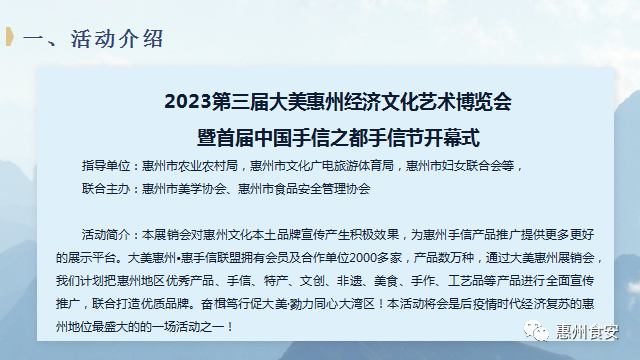 “第三届大美惠州经济文化艺术博览会”总决赛同时进行……精彩纷呈,观众游客预计超万,将带来众多合作商机。