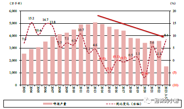 啤酒产量在2013年突破5000万千升后见顶回落,如今稳定在3500万-3800万千升之间。2022年,国内啤酒市场发展受到市场消费需求波动的影响,全年实现啤酒产量3,568.7万千升,同比增长1.1%,预计未来这一数字仍将保持稳定。