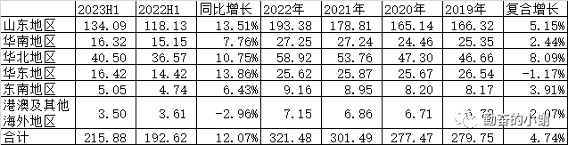 近几年业绩增长绝对值来自于山东地区,相对增速来自于华北地区,但复合增速也仅为8.09%。