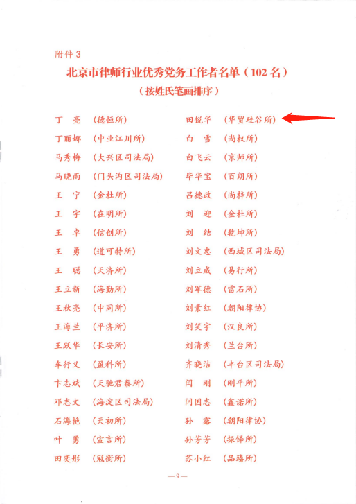 华贸硅谷律师事务所联合党支部书记、事务所创始合伙人田锐华荣获中共北京市律师行业委员会授予的“优秀党务工作者”荣誉称号