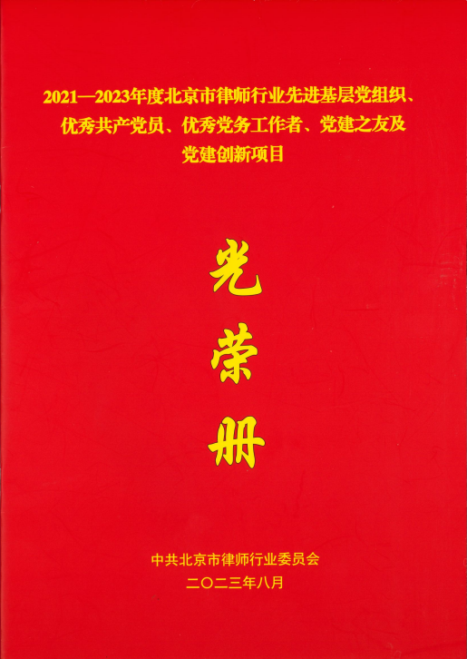 2023年8月27日,北京市律师行业党委召开党建工作先进典型表彰会。会上对55个北京市律师行业先进基层党组织、109名北京市律师行业优秀共产党员、102名北京市律师行业优秀党务工作者、106名北京市律师行业党建之友、20个北京市律师行业党建创新项目进行表彰,并为获奖代表颁发奖牌和证书。