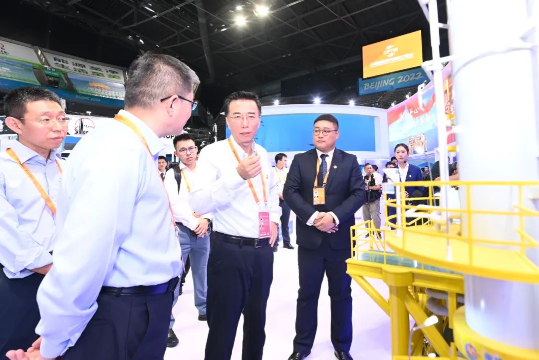 下午,汪东进来到服贸会中国海油展台,实地查看包括十二缆深水物探船“海洋石油720”、“海亮”固体电缆、“海龙”水下采油树、二氧化碳注气压缩机橇、全容式LNG储罐、炼化板块沙盘等覆盖产业链上中下游的各类展品,详细询问重大装备设施的建造、应用,深入了解相关领域科研投入和成本管控情况,并围绕品牌建设与展台工作人员现场交流。