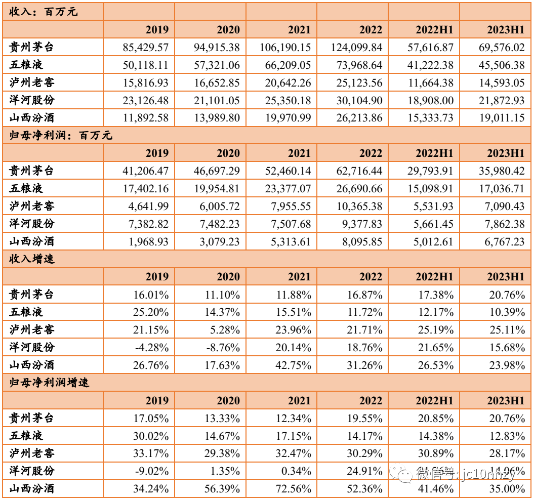 2023年上半年第一名茅台收入696亿,利润360亿;第二五粮液收入455亿,利润170亿;老窖、洋河、汾酒处于三 四 五。其中茅台的收入和利润都非常稳定;五粮液增速最慢;洋河从增速开始恢复;汾酒在利润增速最高,收入增速低于泸州老窖。