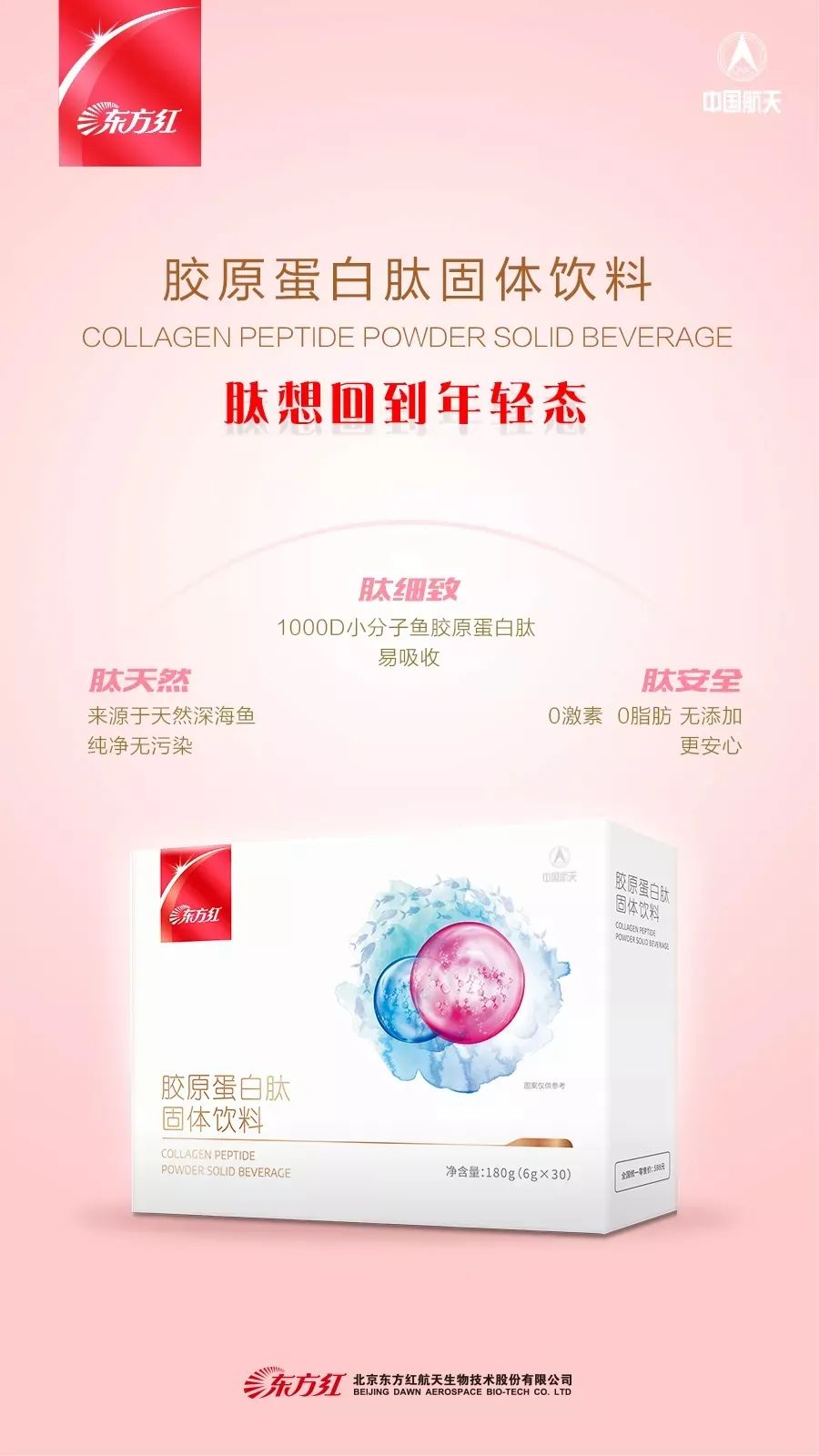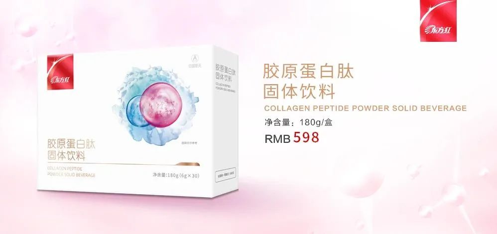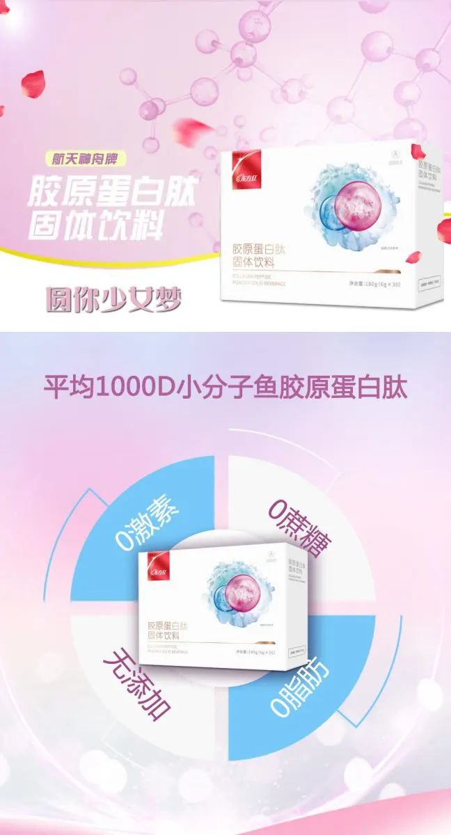 航天神舟牌胶原蛋白肽固体饮料以优质小分子鱼胶原蛋白肽粉、蓝莓粉、壳寡糖、维生素C等为主要原料研制而成,产品水溶性好,易于冲调,且不含脂肪,不添加激素、蔗糖,营养又美味,食用更安心。