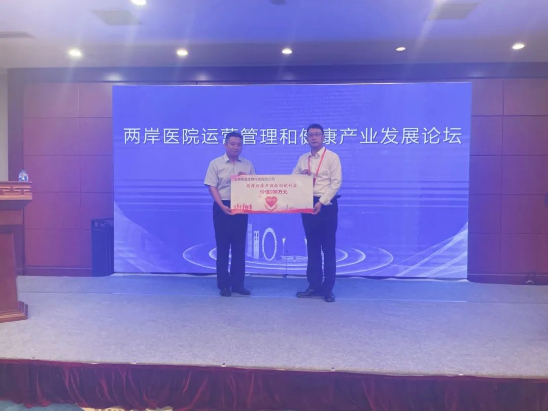 为助力推进两岸精准医学合作,本次洽谈活动中锐翌生物向潍坊市教育局捐赠价值100万元的肠癌早期检测试剂盒。由锐翌生物董事长秦楠博士、潍坊市教育局三级调研员、市教育工会主席周少平先生上台捐赠。