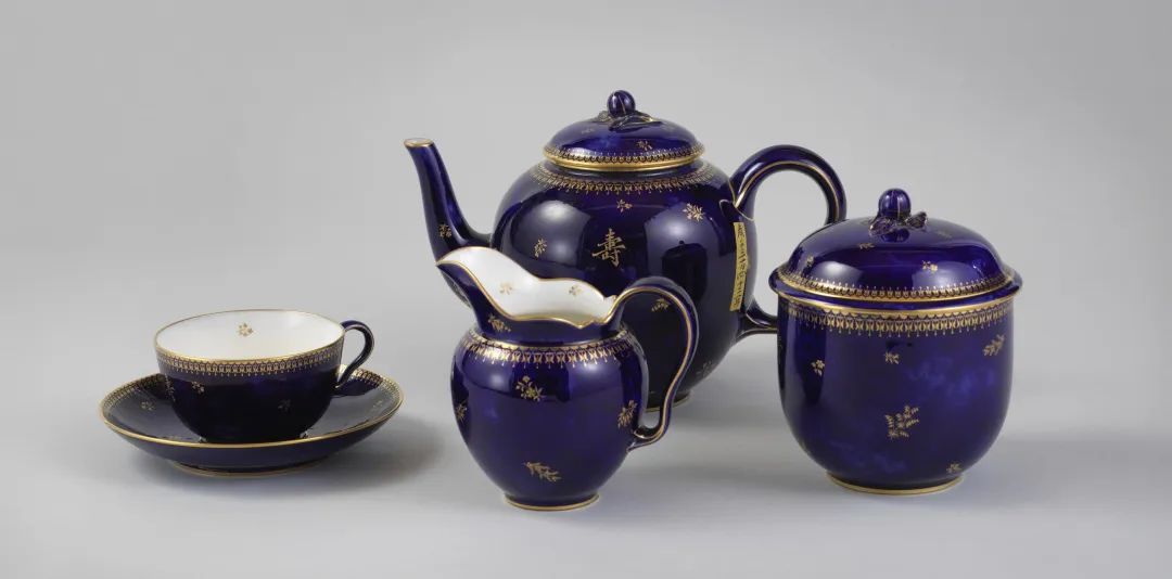 在影响世界的同时,中国茶文化也受到其他国家的影响,清代宫廷便会陈设、使用产自西方国家的茶器。比如这套来自法国的蓝釉茶具,其中的单耳茶杯、茶托、奶壶是符合西方饮茶习惯的典型茶器,体现了清代宫廷对西方饮茶文化的接纳与吸收。