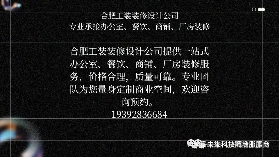 合肥工装装修设计公司提供一站式办公室、餐饮、商铺、厂房装修服务,价格合理,质量可靠。专业团队为您量身定制商业空间,欢迎咨询预约。
