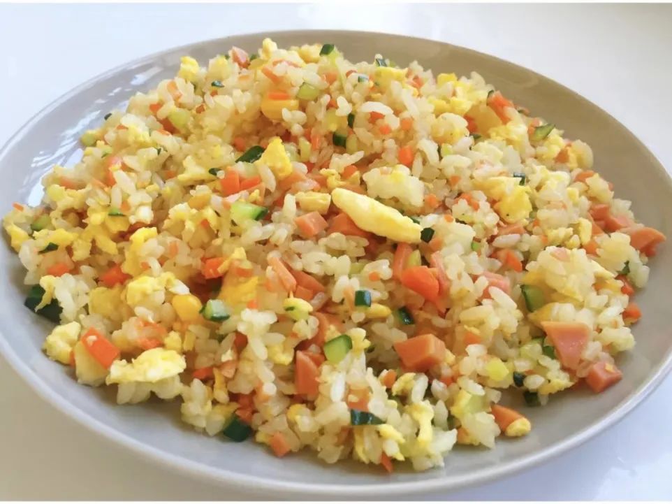 什锦炒饭:大米 鸡蛋 黄瓜 胡萝卜 玉米粒 火腿 木耳