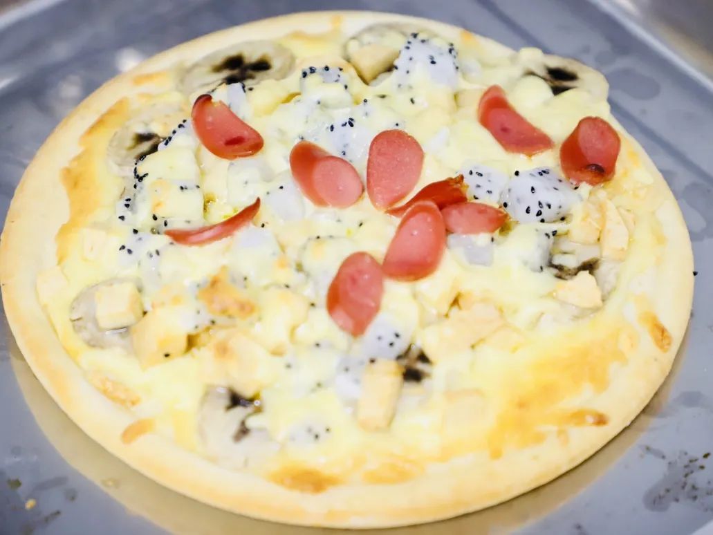 什锦披萨:面粉 培根 芝士 洋葱 青椒 什锦菜