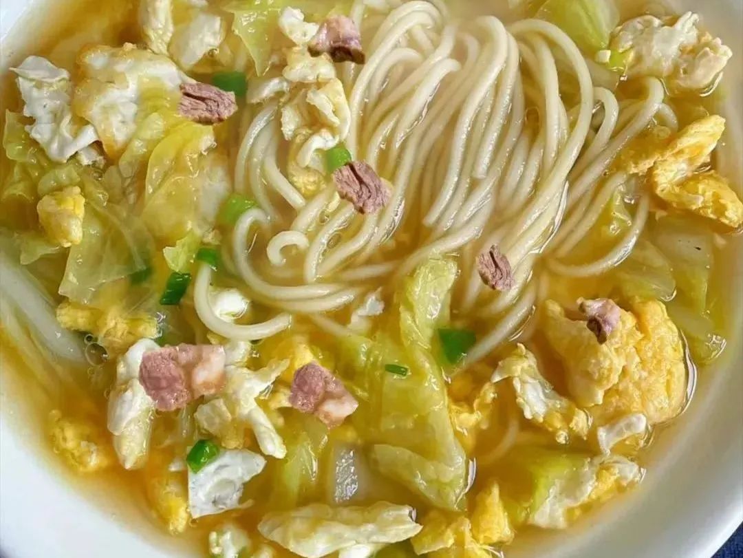 小白菜鸡蛋面:面条 肉丝 小白菜 鸡蛋