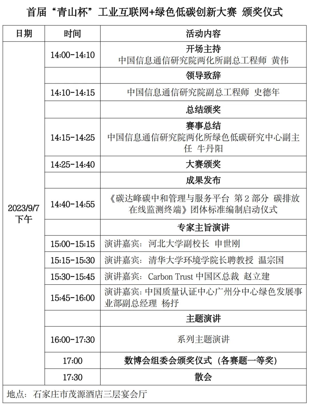 中国国际数字经济博览会是经党中央、国务院批准的,由工业和信息化部、国家发展和改革委员会、河北省人民政府共同主办的国家级博览会,2023中国国际数字经济博览会(以下简称“数博会”)定于9月6日-8日在河北正定召开。中国信息通信研究院在本次数博会期间组织举办首届“青山杯”工业互联网+绿色低碳创新大赛(以下简称“大赛”)决赛,大赛旨在发掘遴选工业互联网赋能绿色低碳发展的新技术、新装备、新模式、新应用,探索数字化助力碳排放双控基础能力建设新路径,搭建全国性技术创新与产业互动平台,推动工业绿色化领域技术合作、项目孵化、产融对接,助力我国工业经济实现数字化绿色化转型升级。