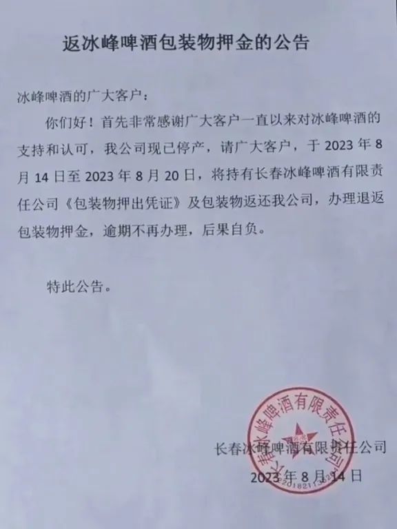 然而,2023年8月14日,长春仅存的地产啤酒品牌冰峰啤酒宣布停产。门口公告称:“尊敬的广大客户,感谢您一直以来对冰峰啤酒的支持和认可。由于经营不善,我公司现已停产。请您于2023年8月14日至2023年8月20日将《包装物押出凭证》及包装物返还我公司,逾期不再办理,后果自负。特此公告!”