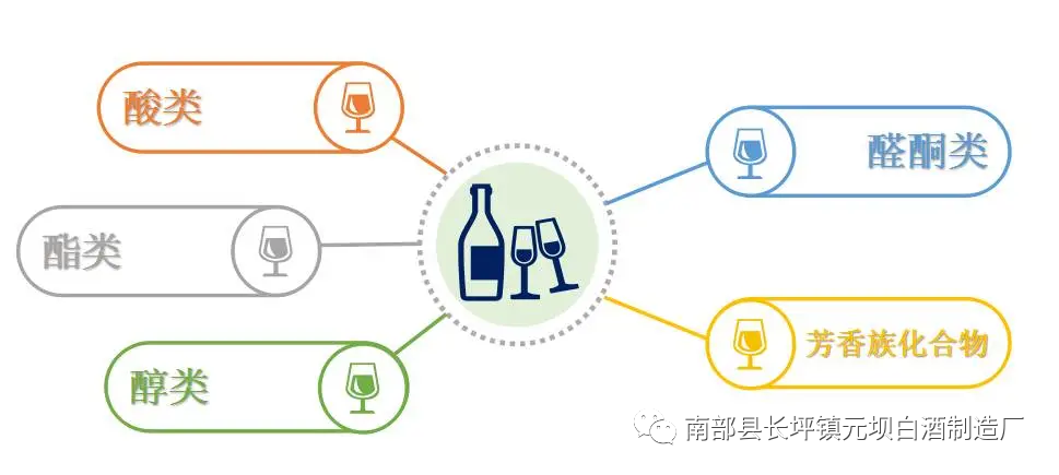 白酒的香气是指人们利用其嗅觉对白酒进行闻嗅后吸入的一种气味成分。它是挥发性的放香物质分子在空气中扩散后,进入人的鼻腔内刺激嗅觉器官,通过神经信息的传递与整理,于是产生一种香感,即香气。而这些放香物质指的便是一些微量物质,通常,我们将它们分为这五大类:
