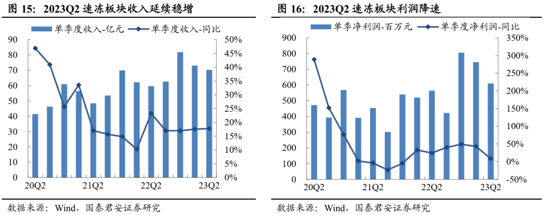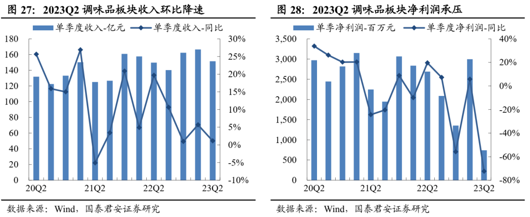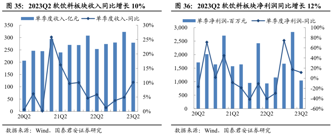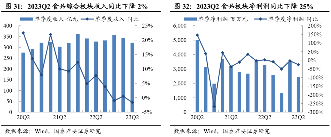 食品饮料子版块分化加剧,白酒表现亮眼。2023Q2食品饮料板块收入2681亿元、同比+7%,净利润430亿元、同比+8%,板块内部进一步分化,高端品板块白酒收入和利润增速明显高于大众品。
