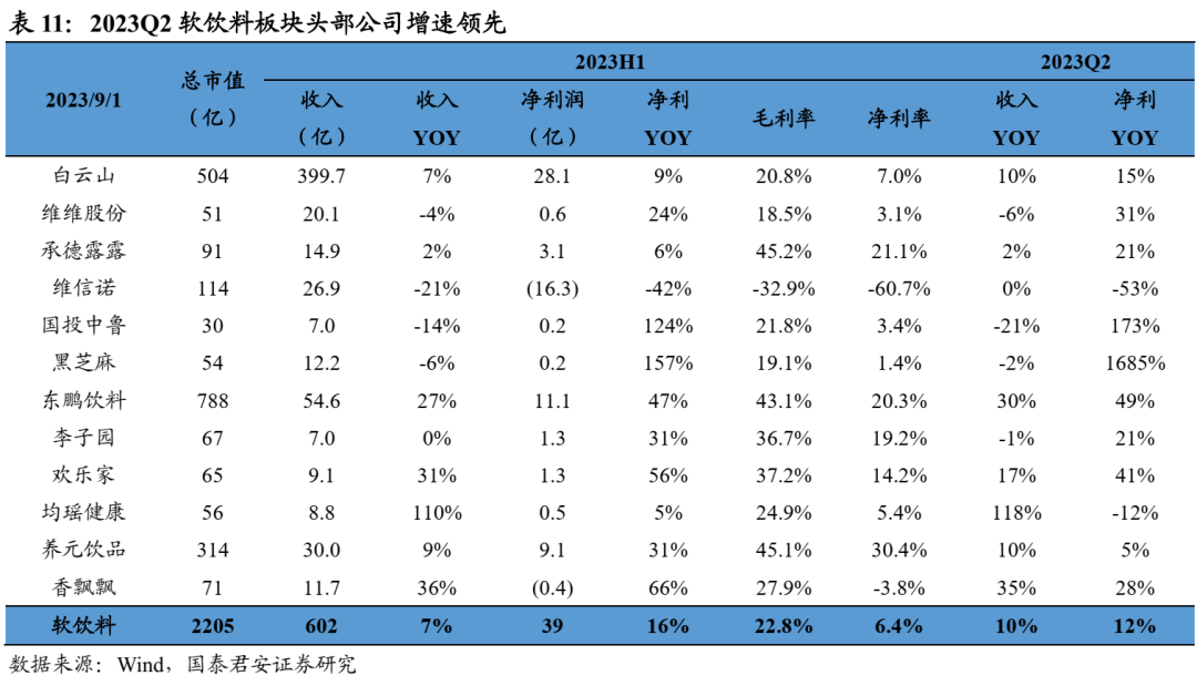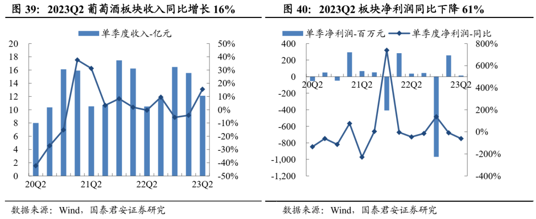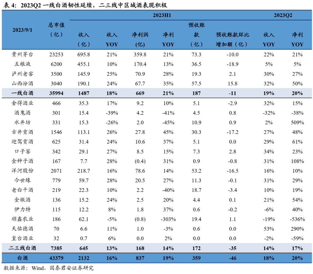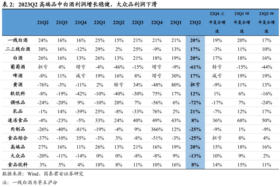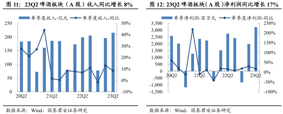 白酒:分化加剧,高端韧性、区域酒高增。2023H1白酒板块收入+16%、利润+19%,整体表现延续韧性;23Q2板块收入826亿、净利润301亿,分别同比+18%、+20%,低基数下增速大个位数提升。Q2一线白酒收入+19%、利润+20%,业绩韧性较强;二三线白酒收入+14%、利润+17%,其中区域酒表现亮眼。利润率方面,Q2一线、二三线酒企净利率分别同比+0.5pct/+0.4pct。