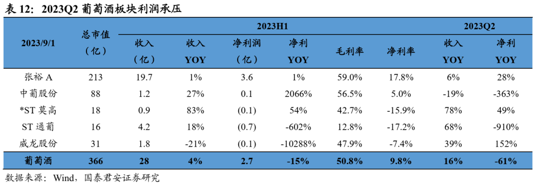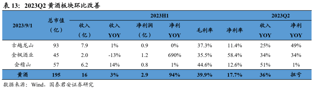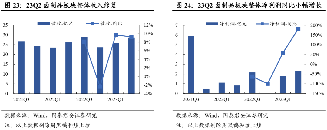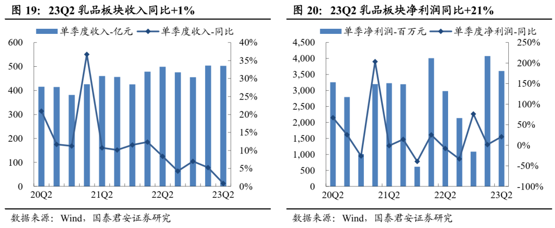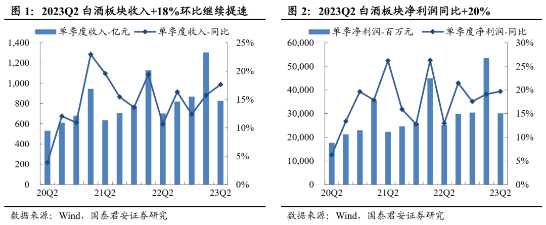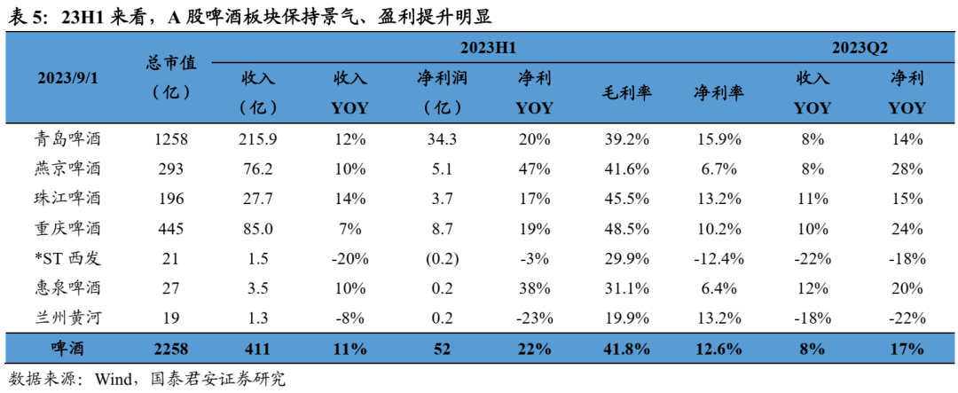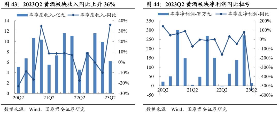 白酒:分化加剧,高端韧性、区域酒高增。2023H1白酒板块收入+16%、利润+19%,整体表现延续韧性;23Q2板块收入826亿、净利润301亿,分别同比+18%、+20%,低基数下增速大个位数提升。Q2一线白酒收入+19%、利润+20%,业绩韧性较强;二三线白酒收入+14%、利润+17%,其中区域酒表现亮眼。利润率方面,Q2一线、二三线酒企净利率分别同比+0.5pct/+0.4pct。