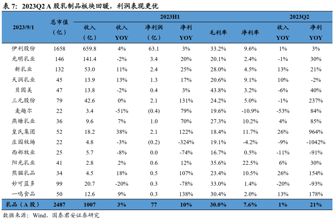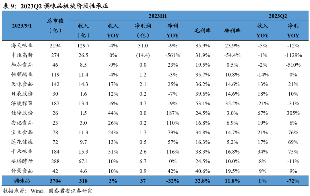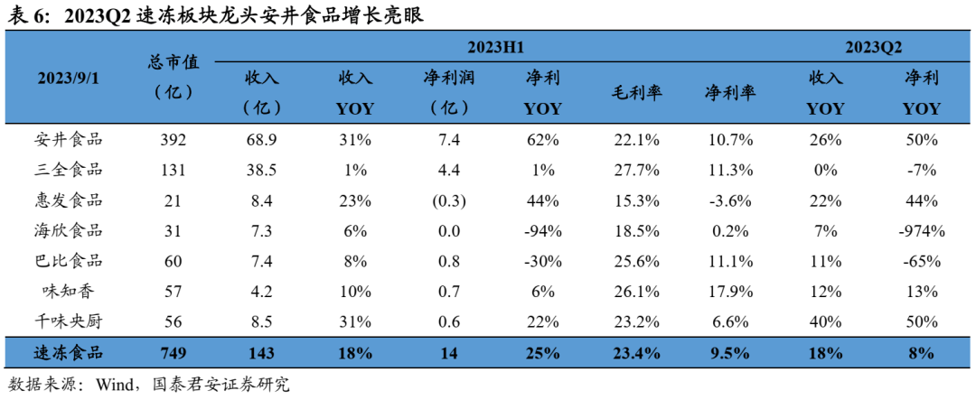 大众品:1)啤酒:结构升级加速,成本压力持续下行。23Q2 A股啤酒收入+8%、归母净利+17%、扣非净利+19%,青啤/燕啤/重啤/珠啤总销量+3.3%,吨价3991元、同比+5.2%,结构持续升级。2)速冻:收入稳增利润降速,龙头势强。23Q2速冻板块收入+18%、增速平稳,利润+8%、龙头安井食品/千味央厨强势领衔。3)乳制品:需求放缓,盈利改善。23Q2 A股乳品板块收入+1%、净利润+21%,需求复苏放缓影响终端动销,原奶价格回落减轻成本压力。4)调味品:消费力疲软下阶段性承压,复调持续亮眼。22Q2板块收入+1%、净利润-7.4%,盈利能力恶化主因结构降级以及成本改善幅度低于预期。5)卤味:集中度加速提升,成本压力逐渐减弱。23Q2 A股卤味板块收入+9.2%、利润+181.7%,行业集中化推动龙头业绩改善。