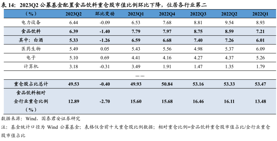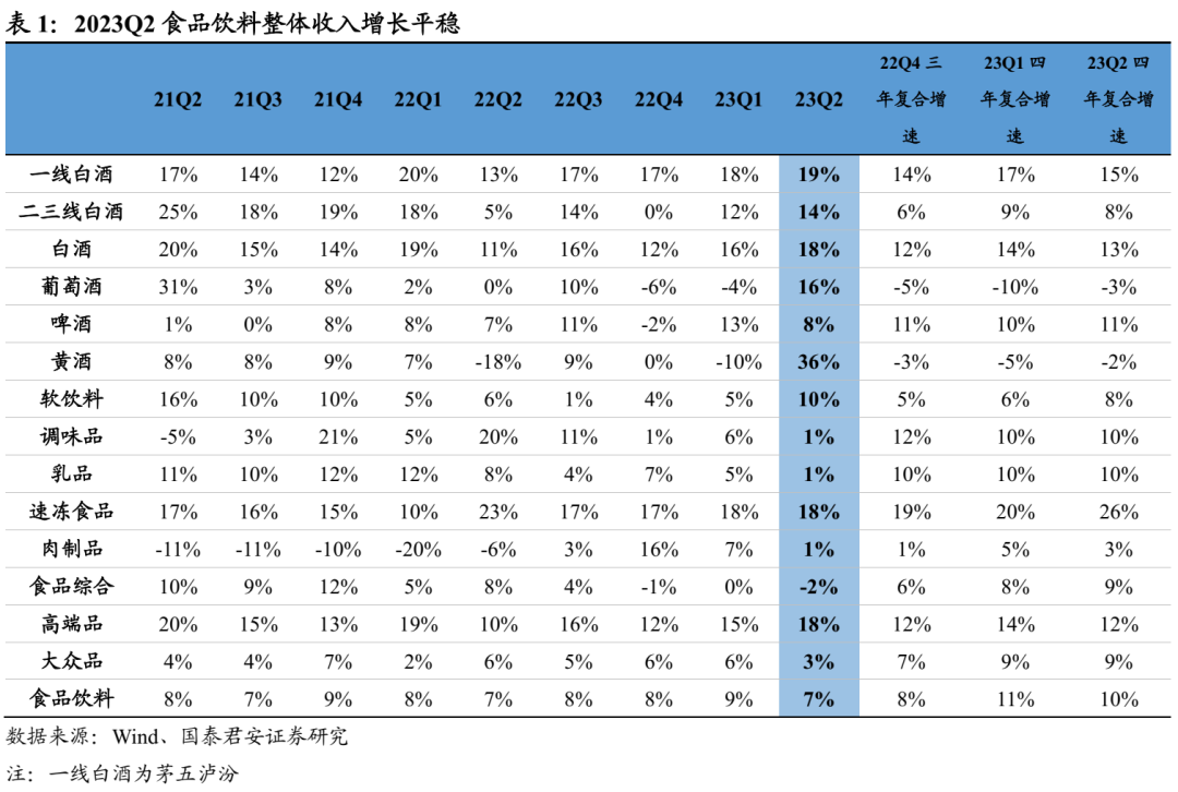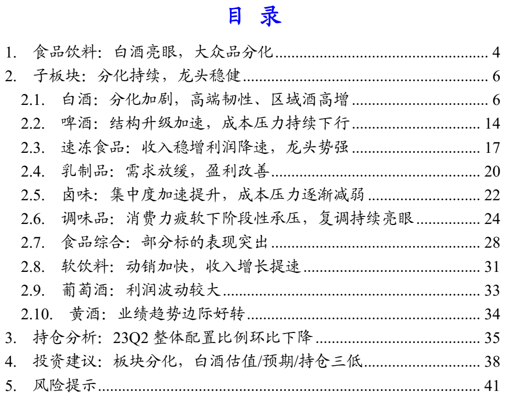 导读:2023Q2食品饮料板块分化加剧,白酒表现最为亮眼,其中高端韧性延续、区域龙头稳健、次高端仍承压;大众品成本压力逐步缓解,啤酒结构升级加速,速冻保持高增。