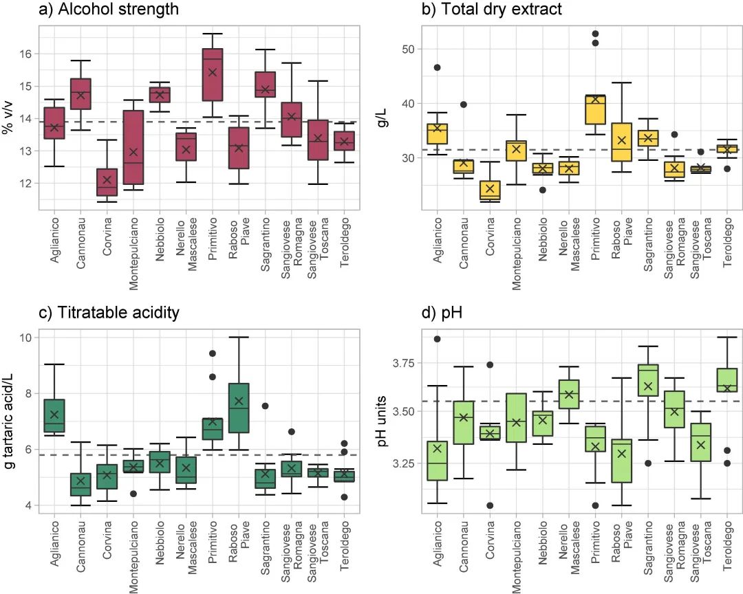 葡萄酒的平均酒精含量为13.9% v/v(图2a),“科维纳”葡萄酒最低(平均12.1%。v/v),“普里米蒂沃”葡萄酒最高(15.4% v/v)。考虑到平均值,这两个品种包含所有其他高数量的成分参数,包括干提取物和甘油。