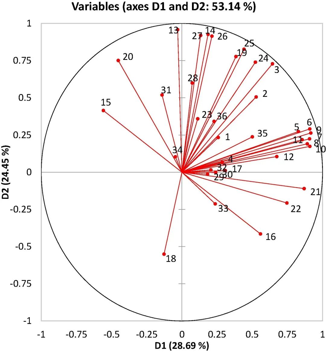 图5 意大利单品种红葡萄酒36个理化参数的PCA图