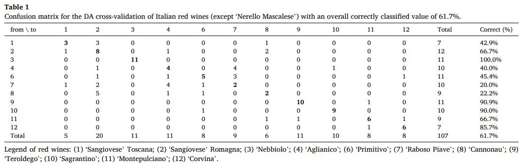 表1 意大利红葡萄酒(“马斯卡斯奈莱洛”除外)的DA交叉验证的混淆矩阵,总体正确分类值为61.7%