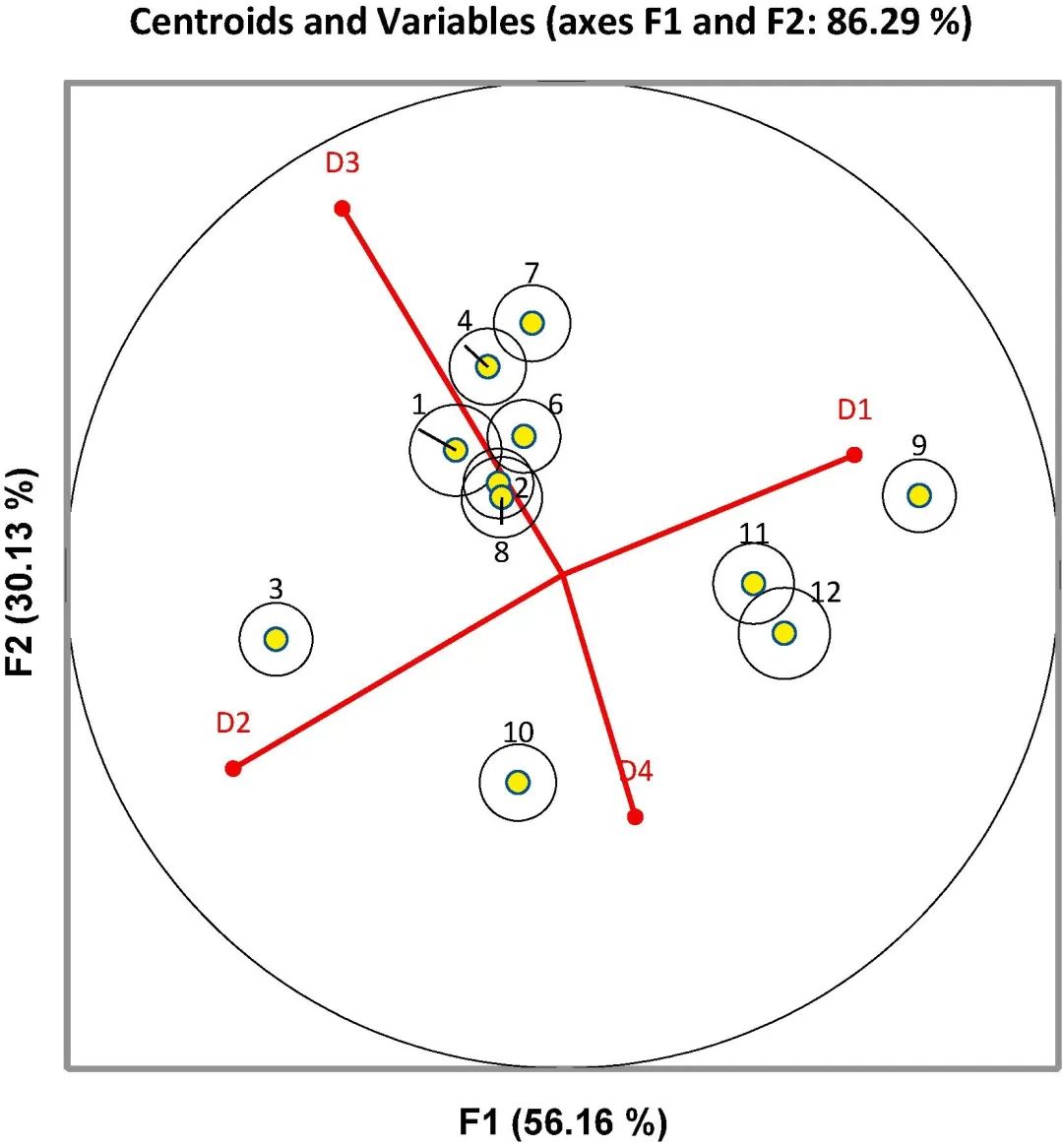 意大利单品种红葡萄酒的LDA图,按质心和变量表示葡萄酒评分,清楚地显示了五个独立的组(图6):形成六种葡萄酒的主要集群,而“内比奥罗”、“泰罗德格”和“萨格兰蒂诺”葡萄酒是具有最有效的区分。