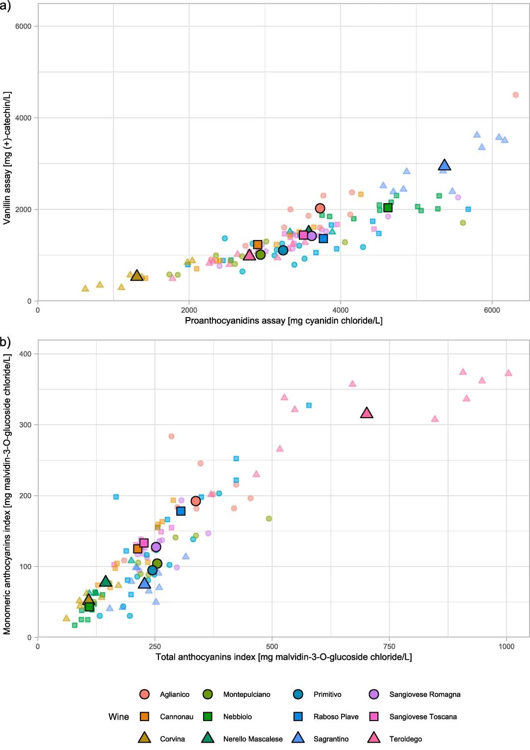 PROC法利用贝特-史密斯反应,是基于原花青素在高温酸性介质中通过黄烷内键的分解解聚,专门用于测量原花青素。相反,VAN对游离黄烷-3-醇和原花青素聚合物的末端单元都很敏感。“VAN/单体花青素”和“单宁/花青素”的比例对于评估葡萄酒在储存过程中低氧暴露下的演变非常有用。萨格兰蒂诺葡萄酒的平均VAN/单体花青素比率约为44,仅次于内比奥罗,后者是黄烷醇含量与前者相似但花青素含量较差的品种,这主要是由于VAN活性黄烷醇的丰富程度。
