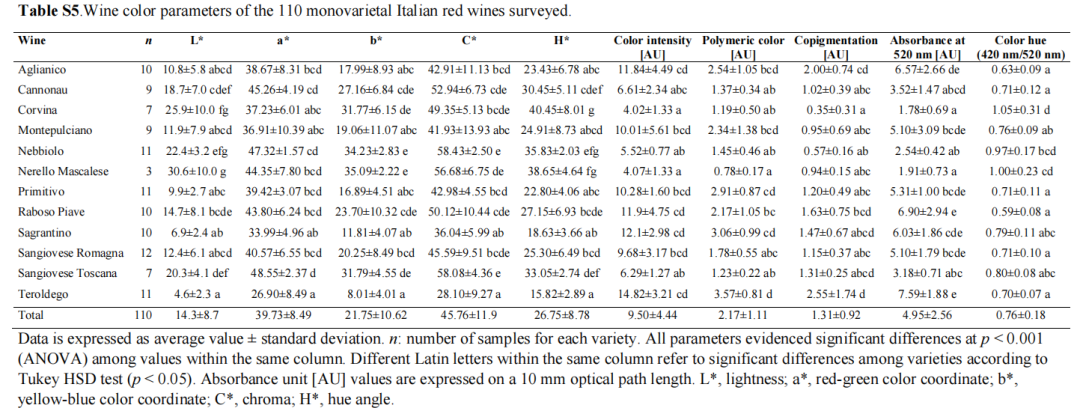 表S5 对110种意大利单一品种红葡萄酒的葡萄酒颜色参数进行了调查。