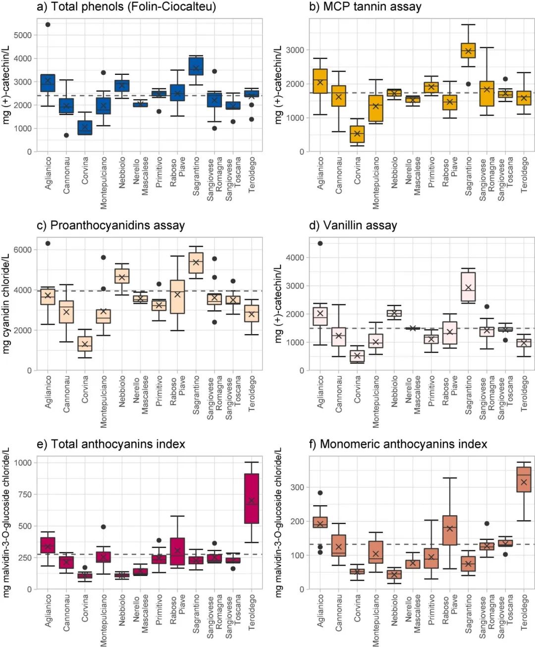 图3 按酒分组的酚类参数的可变性:总酚(a);甲基纤维素可沉淀单宁(b);原花青素(c);香兰素测定(d);总花青素指数(e)和单体花青素指数(f)