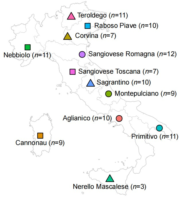 红葡萄酒是酚类化合物的来源,被认为与适度饮用葡萄酒带来的健康益处有关,且在确定红葡萄酒的寿命、颜色、口感和真实性等方面起着关键作用。如今,人们对评估葡萄酒的品种来源越来越感兴趣。但迄今为止,意大利生产的大多数单一品种红葡萄酒的物理化学特征受到研究人员的关注有限。本研究报告了意大利单品种红葡萄酒的理化特征数据,旨在阐明它们与葡萄品种相关的多样性。