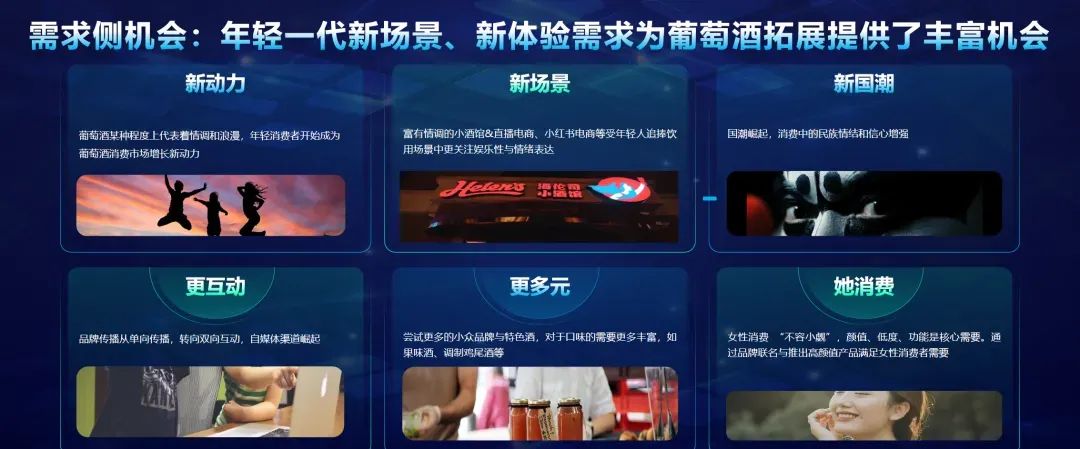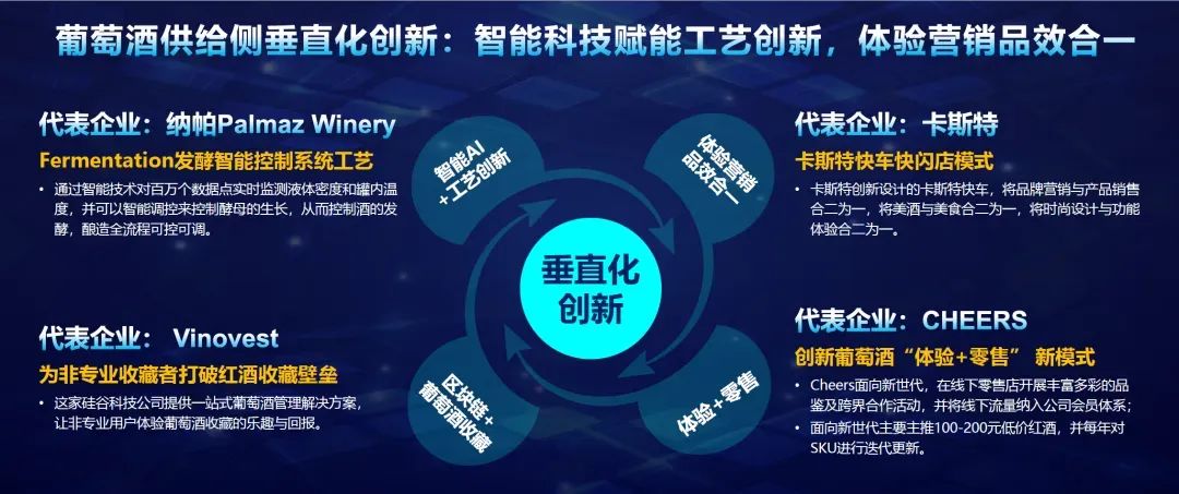 同样,葡萄酒行业甚至整个酒类行业都需要革命。首先,就葡萄酒行业供给侧来说,多家代表企业已分别通过智能科技赋能工艺创新、体验营销实现品效合一等方式引领行业内的垂直化创新。将专业的知识和能力转化为服务资源,用更多生动鲜活的场景揭开葡萄酒行业的神秘面纱,深入影响消费者心智。