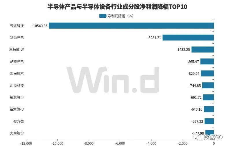 从净利润降幅来看,108家公司2023年上半年净利润同比下降,其中76家公司净利润降幅超50%,气派科技、华灿光电、思特威-W排名居前,净利润降幅分别为10540.35%、3281.21%、1433.25%。