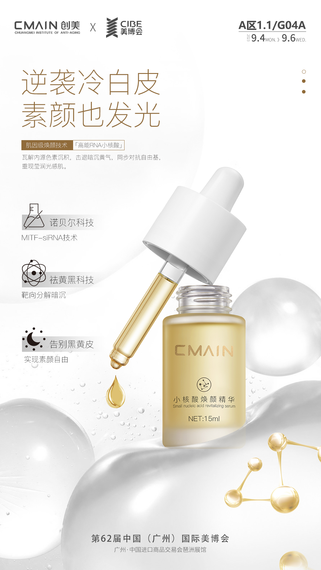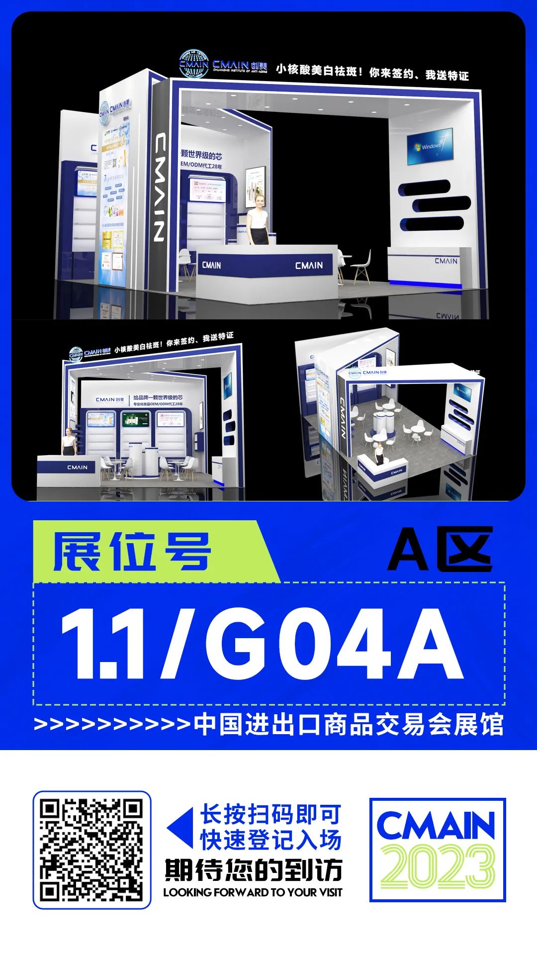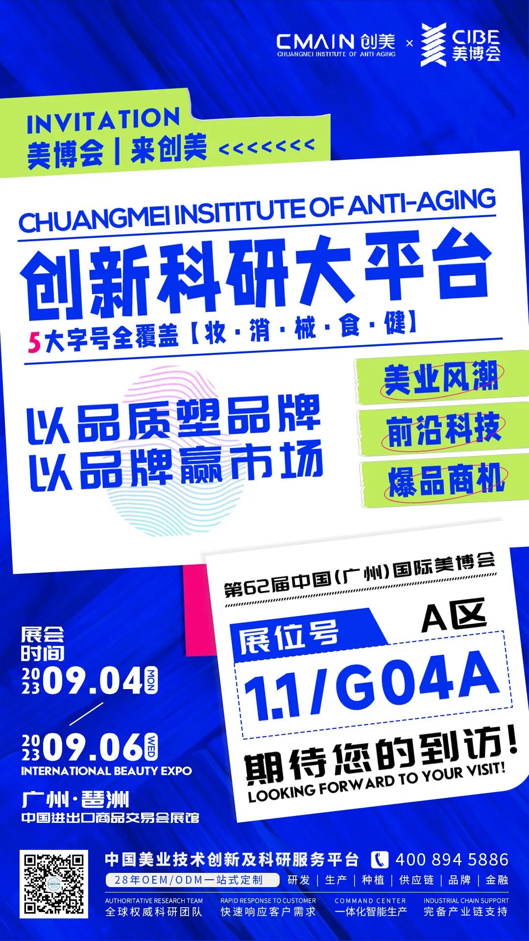 2023年是全球美容行业的又一个关键转折点,创美抗衰老研究院将在A区 1.1/G04A展位,全方位展示原料供应、日化、专业产业链生态,从渠道覆盖、产品系列升级到咨询服务、技术创新、行业发展趋势,为你展现美业源源不断的新活力,为你确立新世代美的新定义。