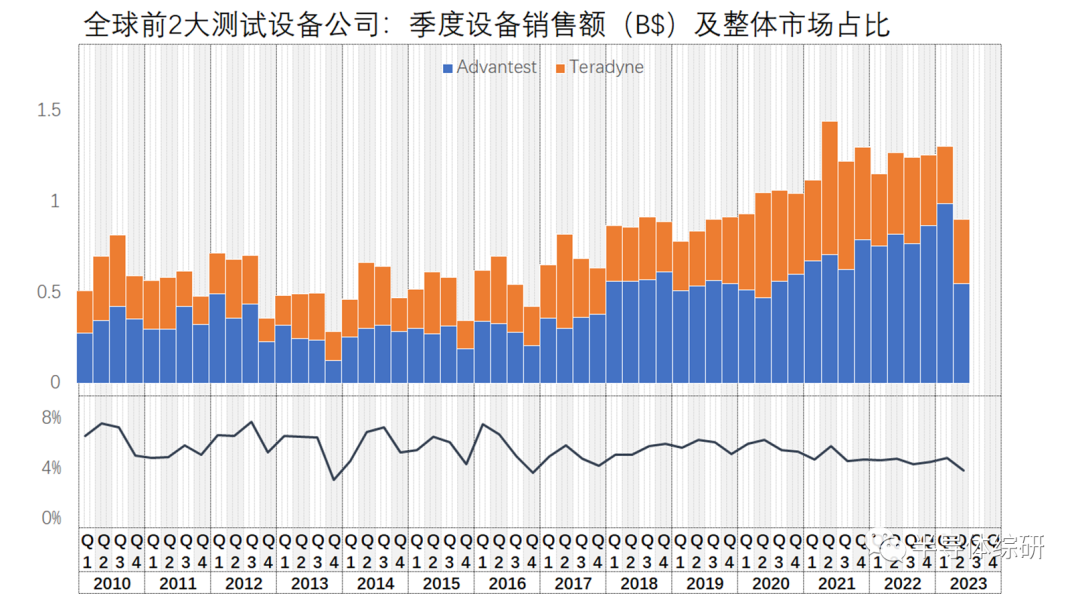 测试行业比较简单,我们只需要关注两家企业的数据即可:爱德万和泰瑞达。这两家的营收总和基本反映了全球ATE市场的情况很明显,在今年Q2,两家的半导体测试设备营收总和出现暴跌,确切地说,暴跌是来自爱德万一家
