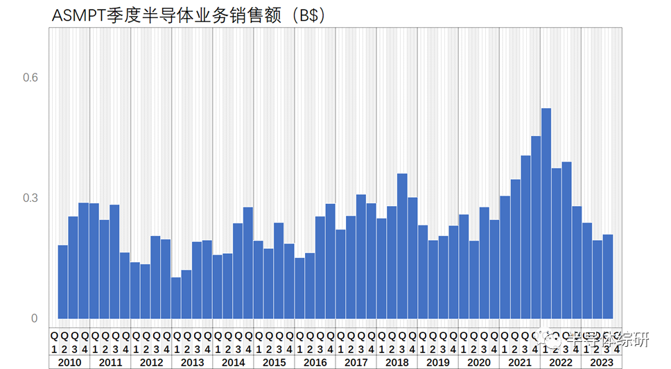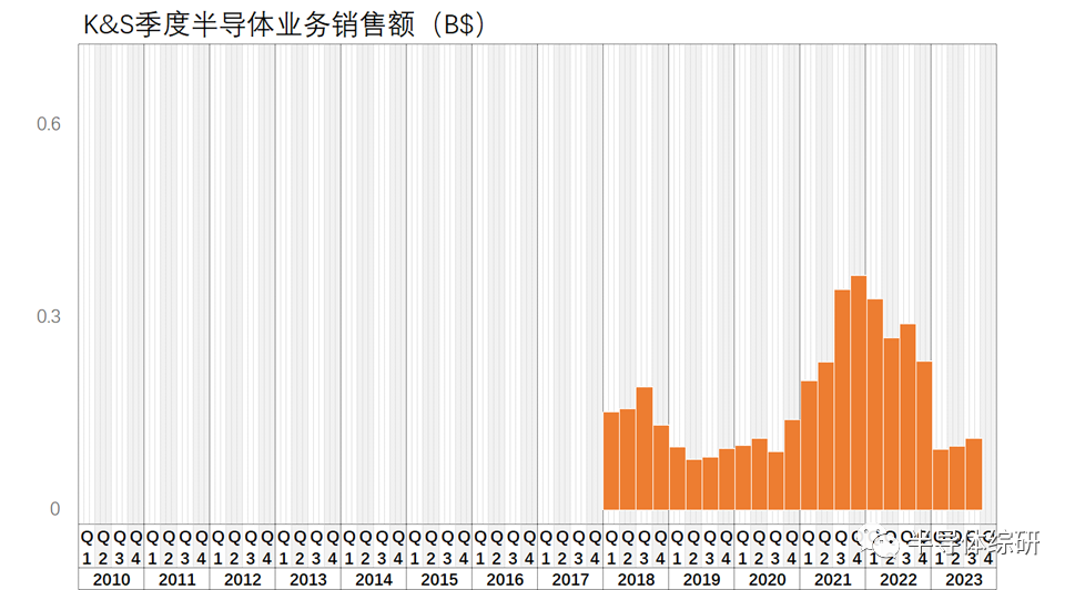 封装领域,我选择了ASMLpt和K&S作为参考样本。很明显,两家在2021年和22年获得巨大的增量,但好景不长,目前两家的业务在去年Q1的时候就开始大幅下降,并很快回调到暴涨前的状态。目前短期内看不到任何增长的机会