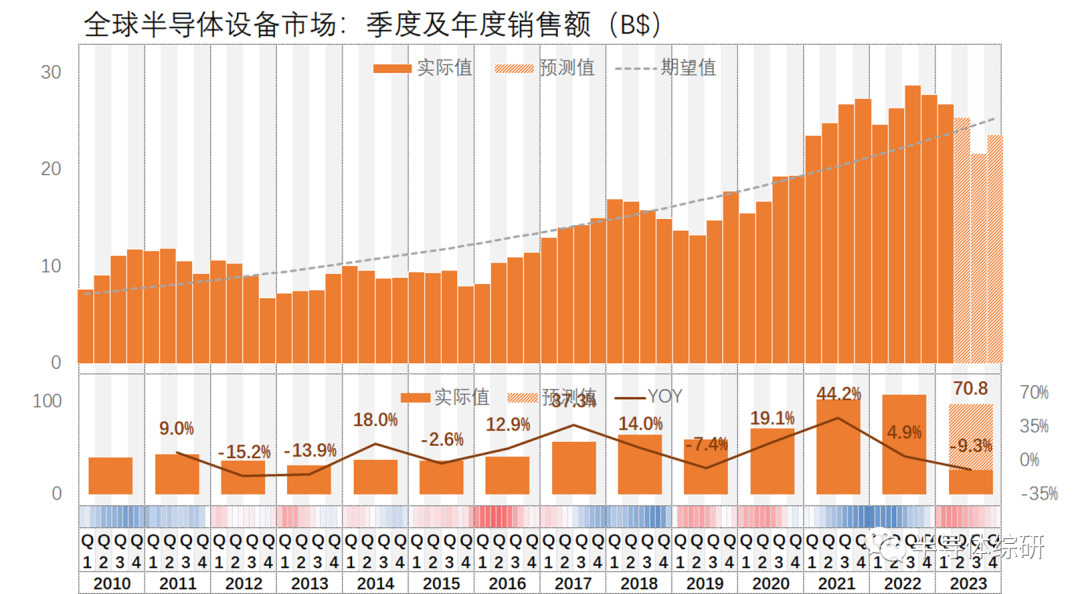 先把整体现状和预期和大家分享一下。由下图可见,全球设备市场其实从今年上半年开始就有衰退迹象了。如果没有意外,按照我的估计,下半年还会有一段更加剧烈的回调。明年的情况不太好说,但大概率反弹力度有限