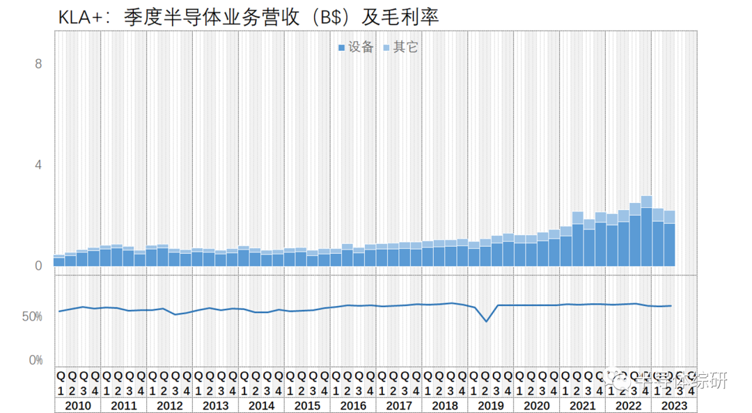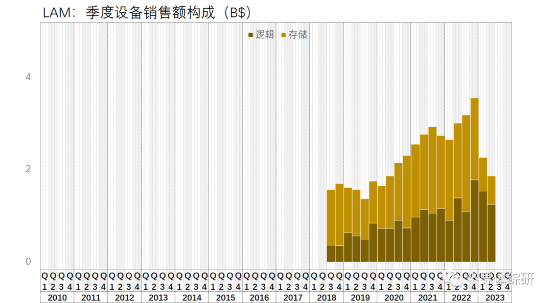 我确认了其财报的细节,发现主要原因是LAM是所有大型设备公司里,存储器市场占总营收比例最高的。最近因为存储器市场的剧烈衰退,使得其的业务受到最大冲击。其实LAM在Logic领域的营收衰退并不明显KLA公司的半导体设备营收虽然也有一定程度下降,但显然相对缓和许多