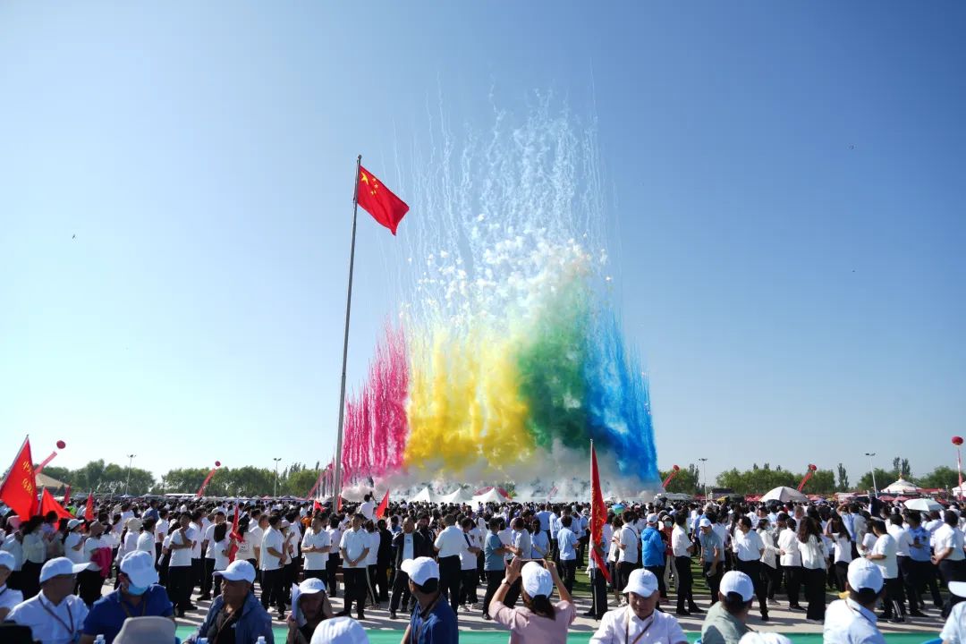在迎宾安代舞《火红的祝福》中,观赏石博览会正式拉开帷幕,身着蒙古族服饰的安代舞表演者在场地内翩翩起舞,红色绸带上下飞舞,场面喜庆壮观。黄土高原的《安塞腰鼓》激情澎湃,辽阔草原的马头琴齐奏《万马奔腾》,神采飞扬的歌伴舞高潮迭起,激昂澎湃的万人合唱振奋人心,掌声和欢呼声回荡天际,现场气氛热烈。