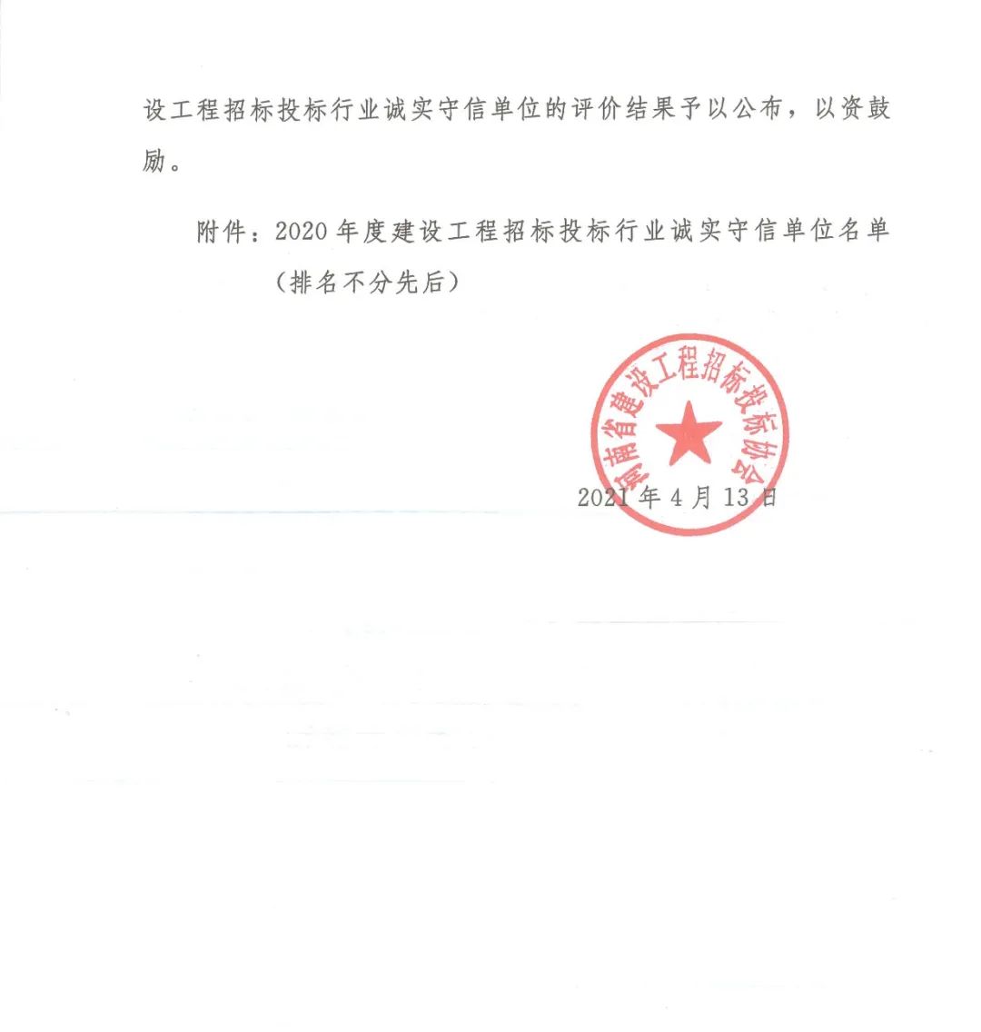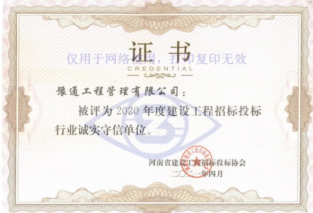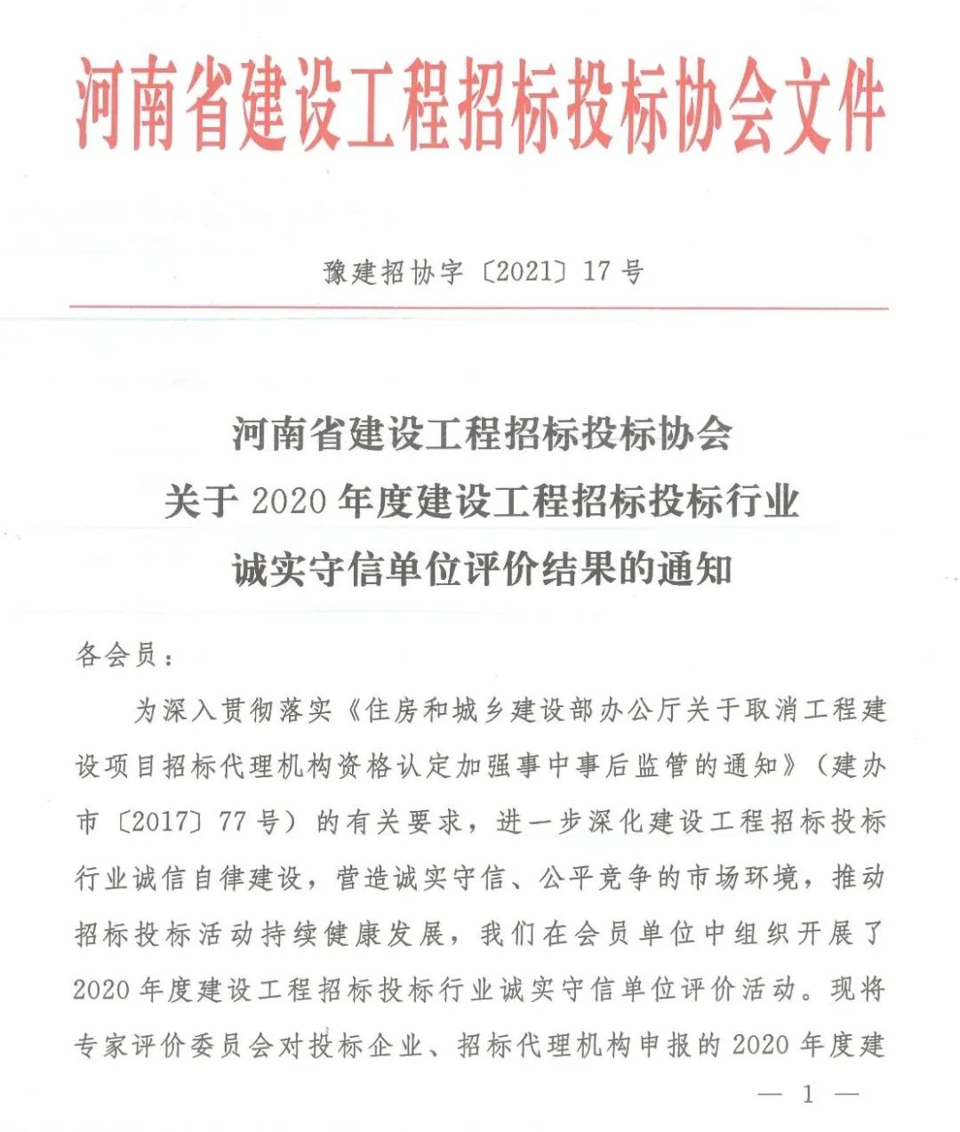 为进一步深化建设工程招标投标行业诚信自律建设,营造诚实守信、公平竞争的市场环境,推动招标投标活动持续健康发展,河南省建设工程招标投标协会在会员单位中组织开展了2020年度建设工程招标投标行业诚实守信单位评价活动。我公司被评为“2020年度建设工程招标投标行业诚实守信单位”。